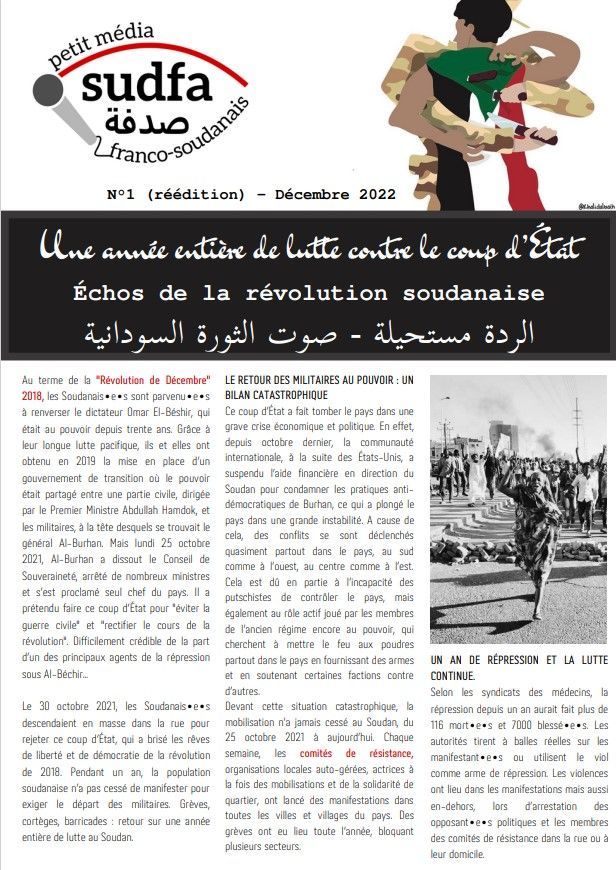 En décembre 2021, l'équipe de Sudfa publiait son premier numéro "papier" pour informer les personnes francophones des mobilisations qui avaient lieu au Soudan contre le régime militaire. Pour cette nouvelle année 2023, nous publions une réédition de cette brochure, mise à jour avec tous les événements qui se sont passés en 2022 !
