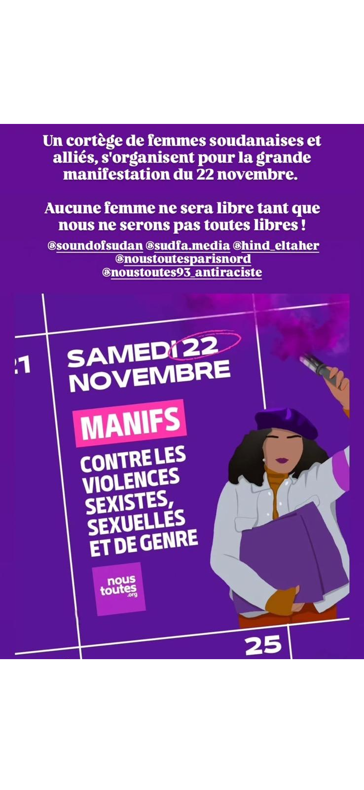 Le collectif Nous Toutes organise des manifestations dans toute la France dans le cadre de la semaine de lutte contre les violences faites aux femmes. L'une d'elle partira a Paris depuis la place de la République, rejoignez Sudfa dans le cortège de femmes soudanaises et allié·es ! 📅 Date : 22 novembre à 14h 📍 Adresse : Place de la République, Paris 11ème