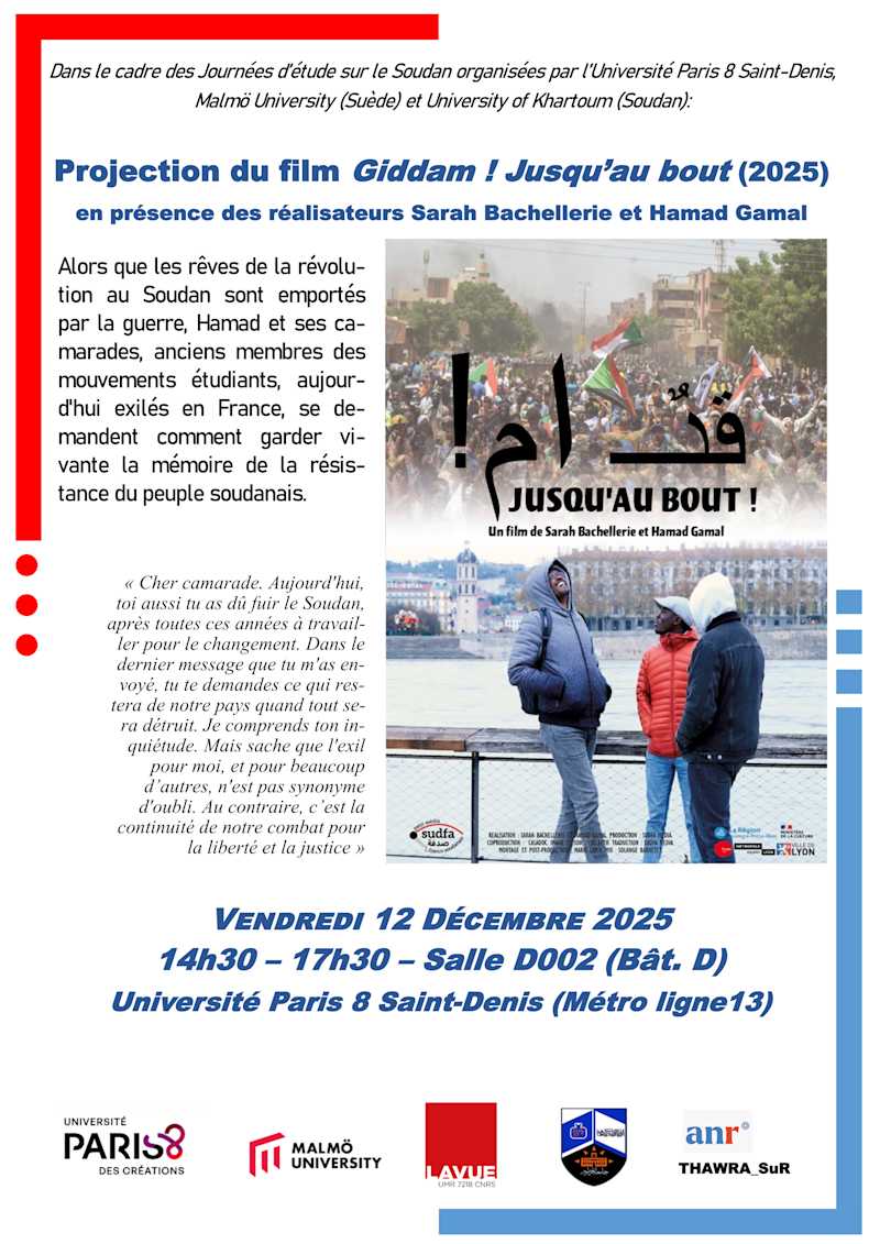 Dans le cadre des Journées d’étude sur le Soudan organisées par l’ Université Paris 8 Saint-Denis, Malmö University (Suède) et University of Khartoum (Soudan), notre film sera projeté, en présence des réalisateurs Sarah Bachellerie et Hamad Gamal.